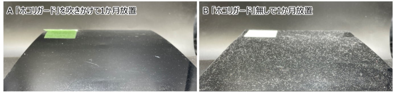 花粉症に悩まされることが多い冬から春にかけての季節。しかし、この時期に注意すべきは花粉だけではありません。実は、冬から春にかけてはハウスダストも増加しやすく、アレルギー症状を引き起こす原因の一つとなっています。その要因として、衣替えや換気不足などが挙げられます。衣替えのタイミングなどに付着しているホコリやハウスダストが舞い上がりやすくなります。弊社のホコリガードスプレーは舞い上がったホコリやハウスダストの付着を防ぐことができます。その効果は同社の検証結果からも明らかで、下記は2つの黒い下敷き(「ホコリガードスプレーを吹きかけて1か月放置した下敷きA」と「ホコリガードスプレーを吹きかけずに1か月放置した下敷きB」)を同じ部屋に並べて1か月放置した結果です。