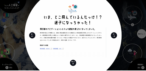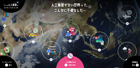 人工衛星の重要さ、私たちの生活が受けている恩恵を「人工衛星がある世界」と「人工衛星がない世界」を比較して、楽しみながら調べたり、体験したりすることができます。