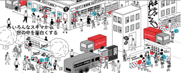 株式会社スキマデパートでは、使われていない”いろんなスキマ”を見つけ出し、そこに新たな価値を創造して世の中に提供します。最大の強みである全国2,500台の飲料自販機を『自由販売機』と称し、商品を持つ企業の新たな販路となるだけでなく、企業の様々なプロモーションができる広告媒体としての新しい価値の創造してきました。”自販機のスキマ”が活かされ、自由販売機が社会のインフラとなることを目指しています。