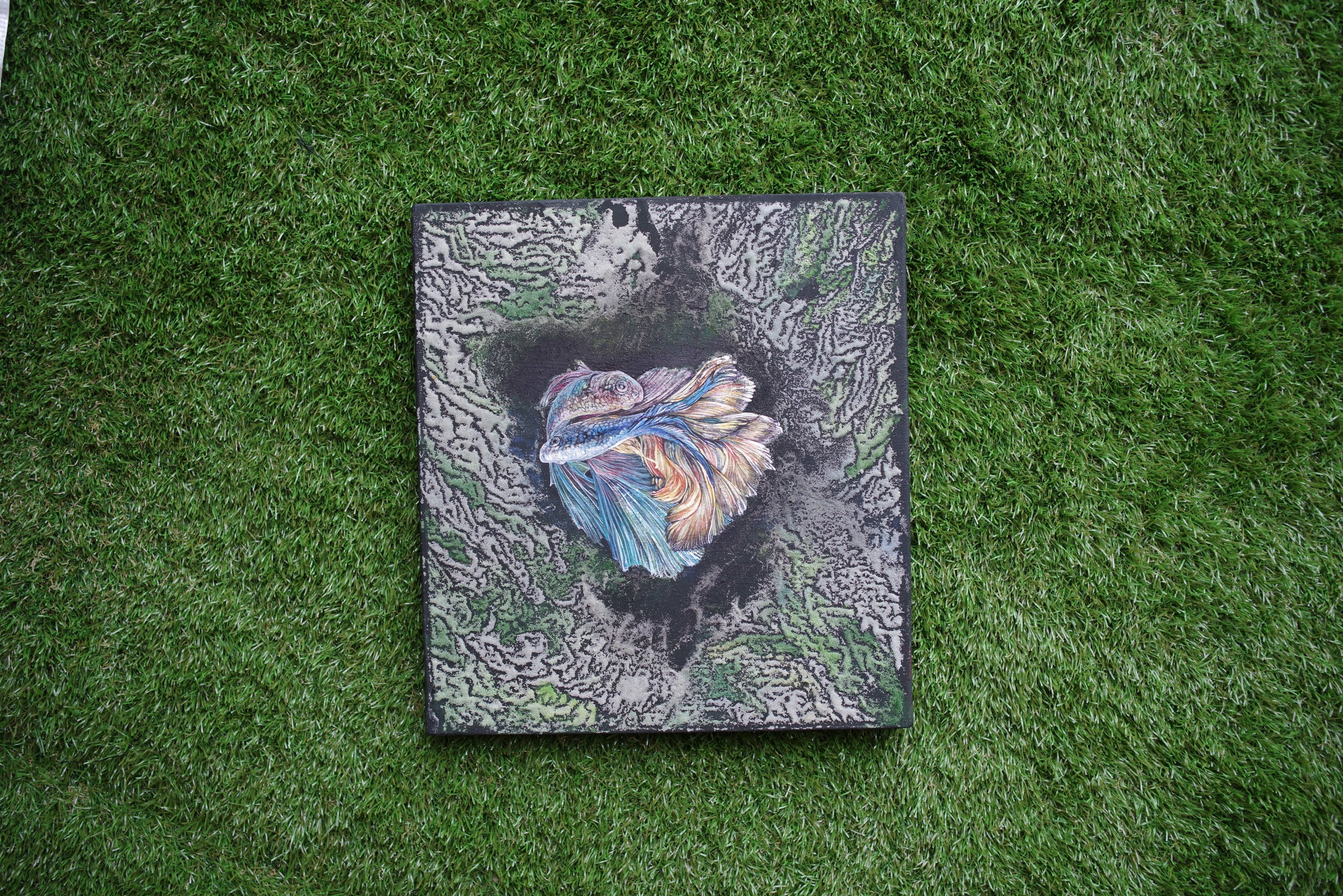 大学卒業後、環境の変化に伴って筆が乗るようになり、最初に描いた作品が「熱帯魚の日本画」です。(Labのリニューアルオープンと同時に完成し、Labで展示させていただいております。)