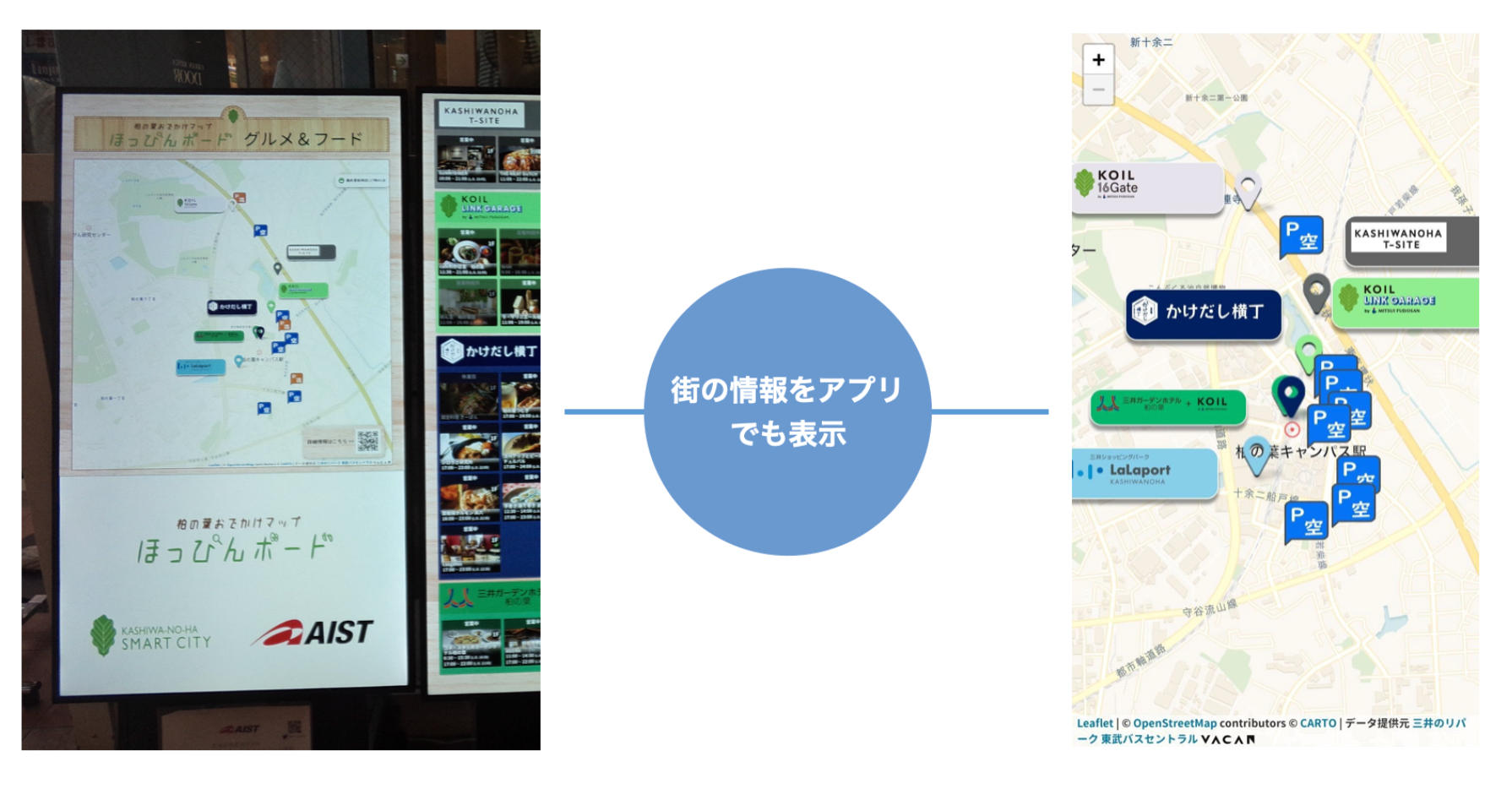 遠隔チェックインサービスは、産業技術総合研究所(産総研)が開発・設置している柏の葉エリアのリアルタイムなグルメ&フード情報を表示するデジタルサイネージ「柏の葉おでかけマップ ほっぴんボード」との情報連携を実現し、街の情報をリアルタイムでアプリ利用患者が取得できる設計が可能となりました。このことにより「まち全体を病院の待合室にする」というコンセプトを強く促進できる協業となっています。