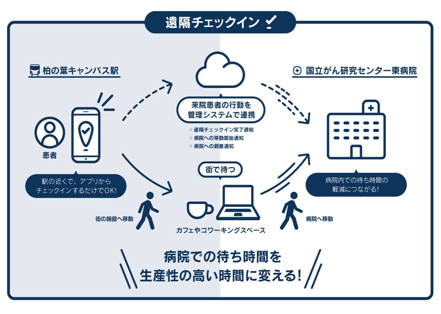 患者は診察当日に病院の最寄り駅である柏の葉キャンパス駅に到着後、遠隔チェックインアプリを開き、予約情報を確認します。その後、遠隔チェックインを行うためのボタンが起動します。患者側でボタンを押しチェックインに成功すると「待ち場所をさがす」画面が表示され来院時刻までの時間を街の施設で快適に過ごすことができます。患者の行動はリアルタイムに病院側の管理画面に通知がされ、再来受付処理が行われるため、患者は予約時刻になると直接診察室に向かうことができるようになります。