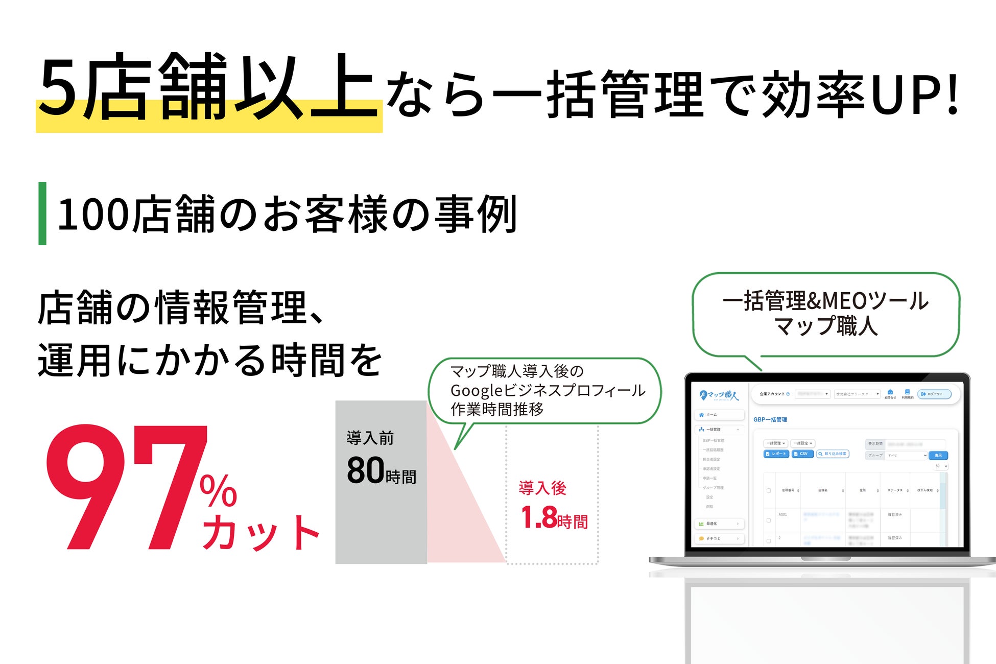 『マップ職人』はGoogleビジネスプロフィールの複数アカウントと連携し、店舗ごとに違う営業時間や、店舗ごとに違う内容の投稿も「一度の操作」で対応できるため、100店舗の場合、情報管理の時間の97%以上カットが実現可能です。