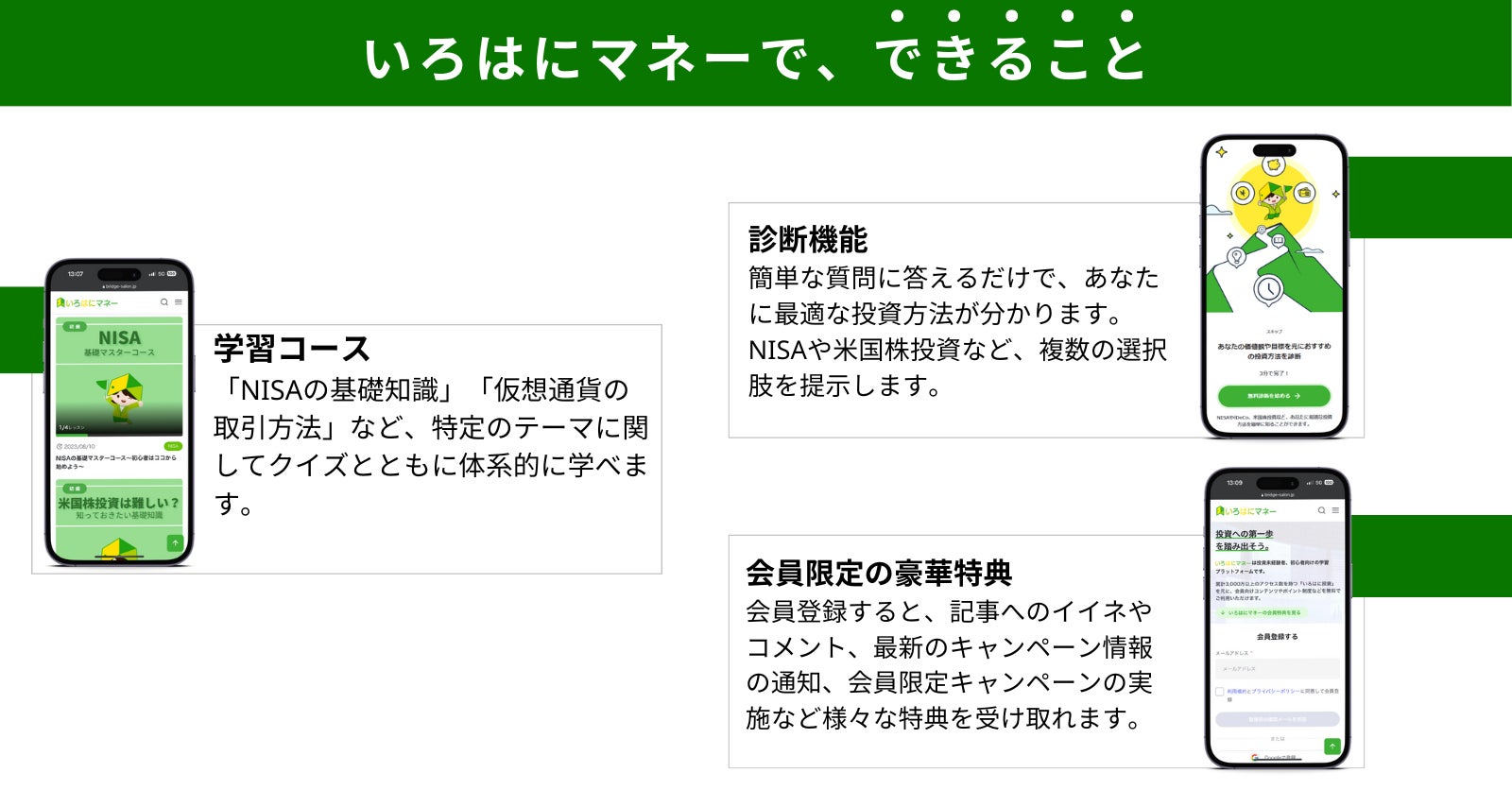 そのような環境の中、読者の方へのインタビューなども実施した上で、投資未経験・初心者の方がより体系的にお金・投資について学ぶことができるプラットフォーム「いろはにマネー」をリリースしました。