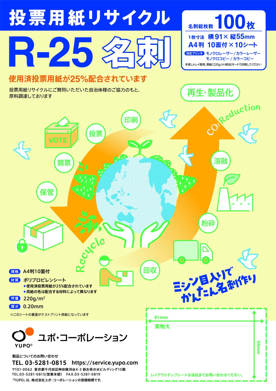 当社は1980年代に投票用紙原紙の製造販売を開始しましたが、この度、環境対応の一環として使用済投票用紙を25%配合した、投票用紙リサイクル R-25 名刺を開発しました。