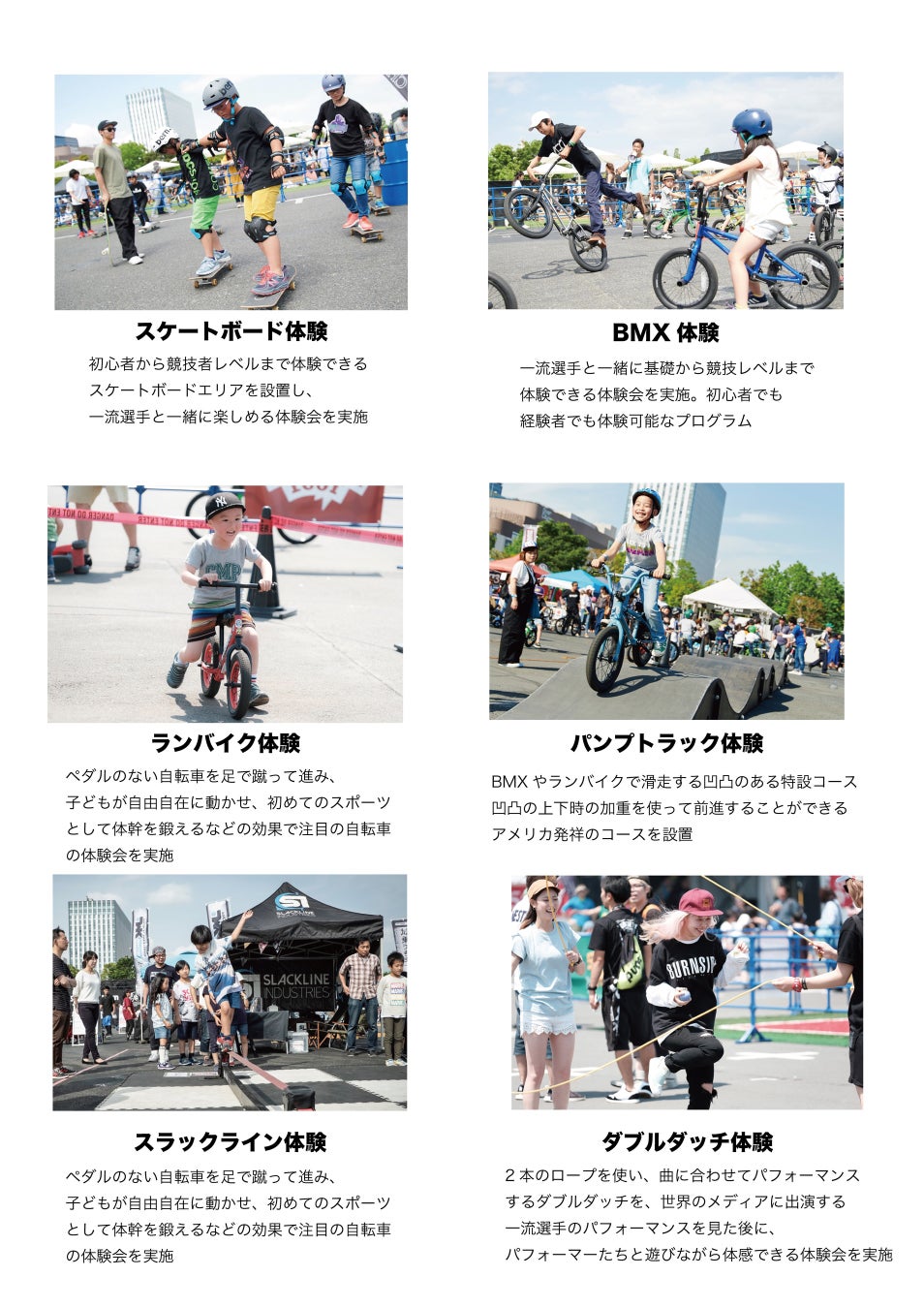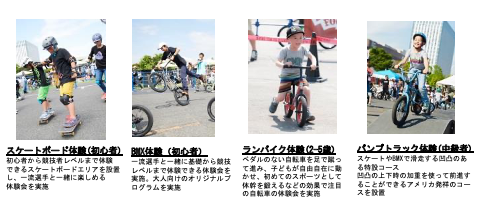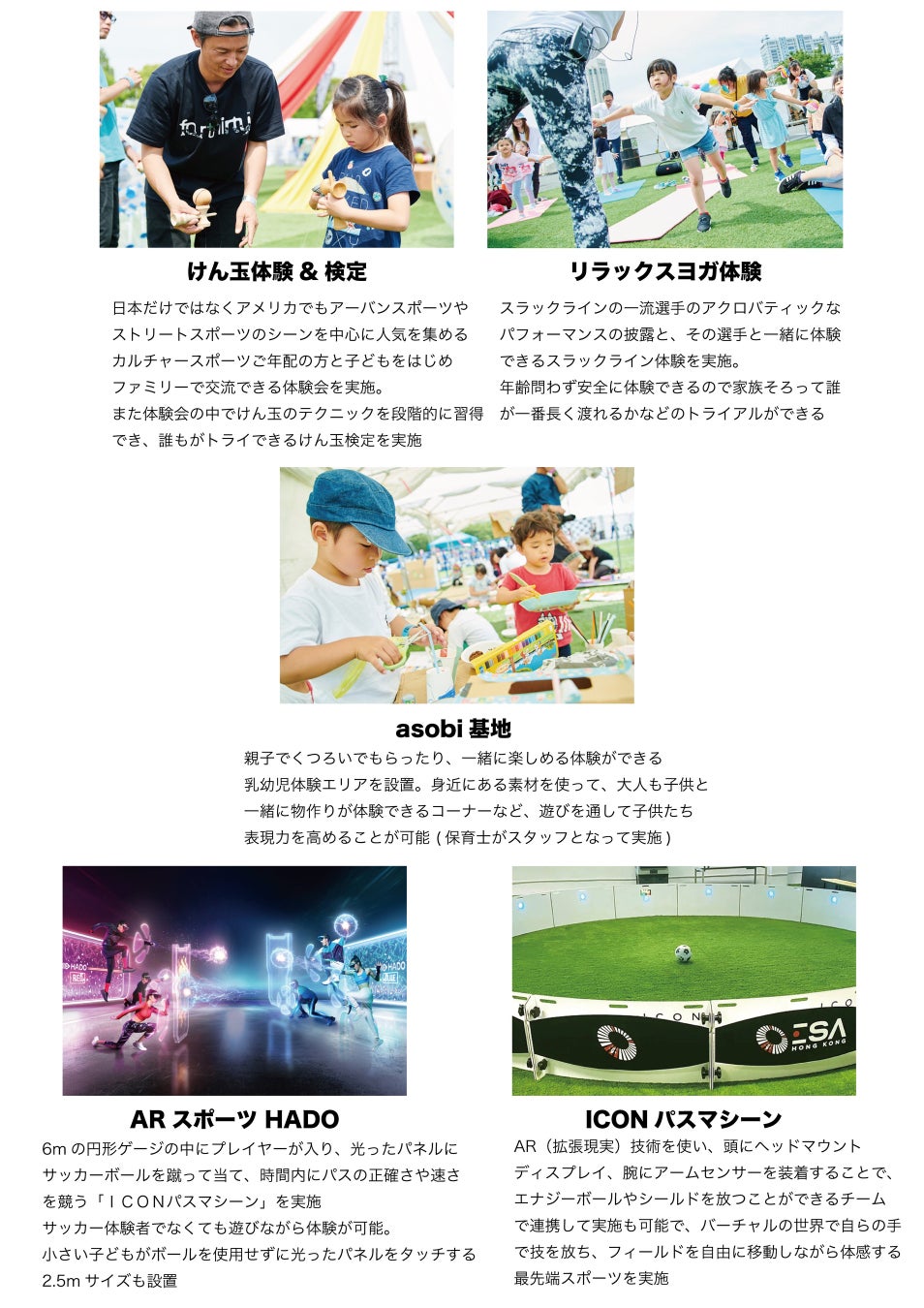また、スケートボードやBMX、ランバイク、ダブルダッチ、スラックラインなどのアーバンスポーツを中心に、最先端テクノロジーを体感できるARスポーツ「HADO」やICONパスターゲットなど、子どもから大人まで誰もが楽しめる体験エリアを設置。ショーパフォーマンスで見たコンテンツを実際に体験することができます。普段なかなか接することのできない様々なジャンルをプロの選手やインストラクターが教えてくれるので、未経験の方でも気軽に体験いただけます。