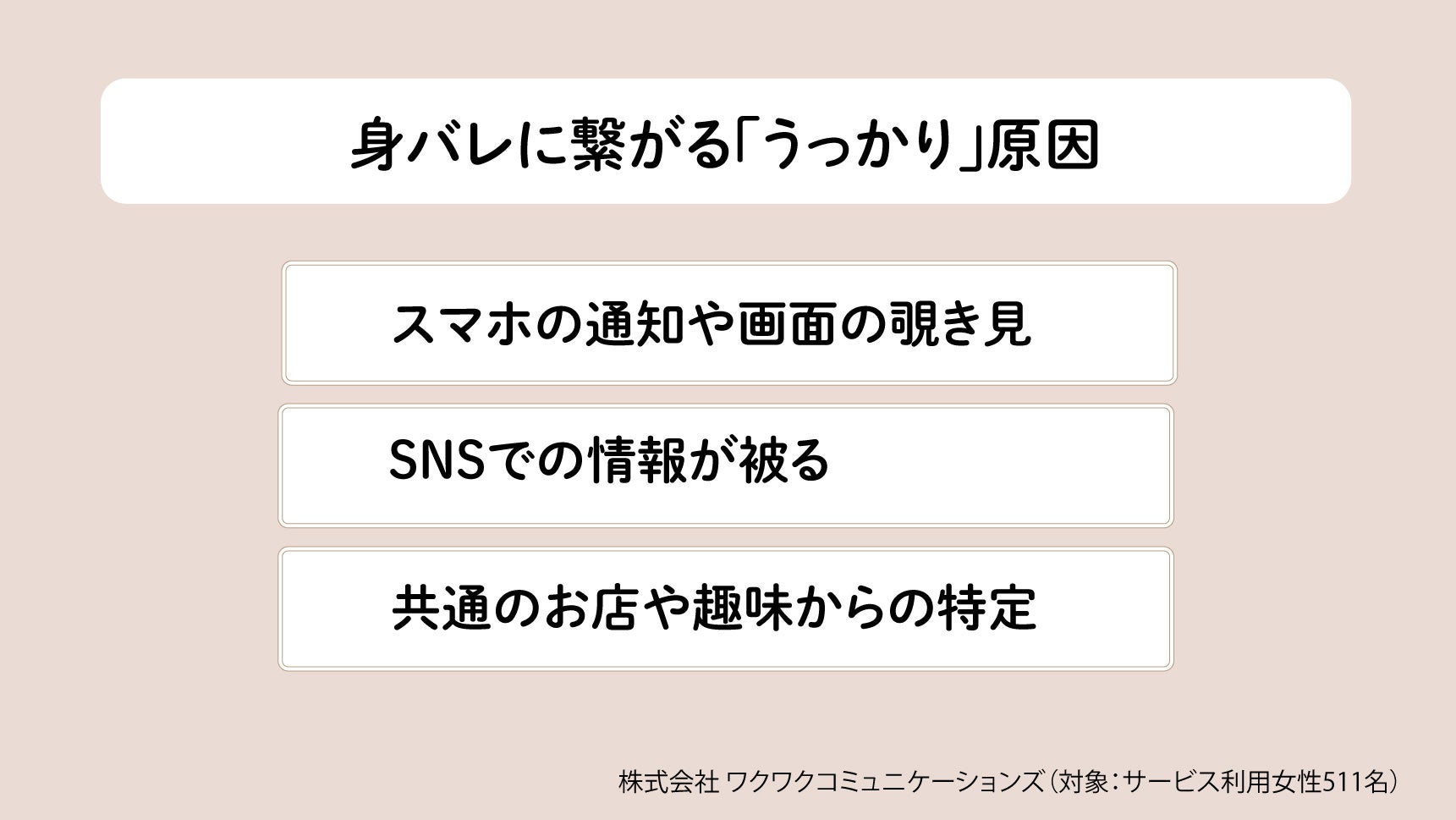 身バレしてしまった人の状況から掘り下げてみると、その原因には「スマホの通知や画面の覗き見」「SNSのアカウント情報が被る」「共通のお店や趣味からの特定」といった共通点がありました。