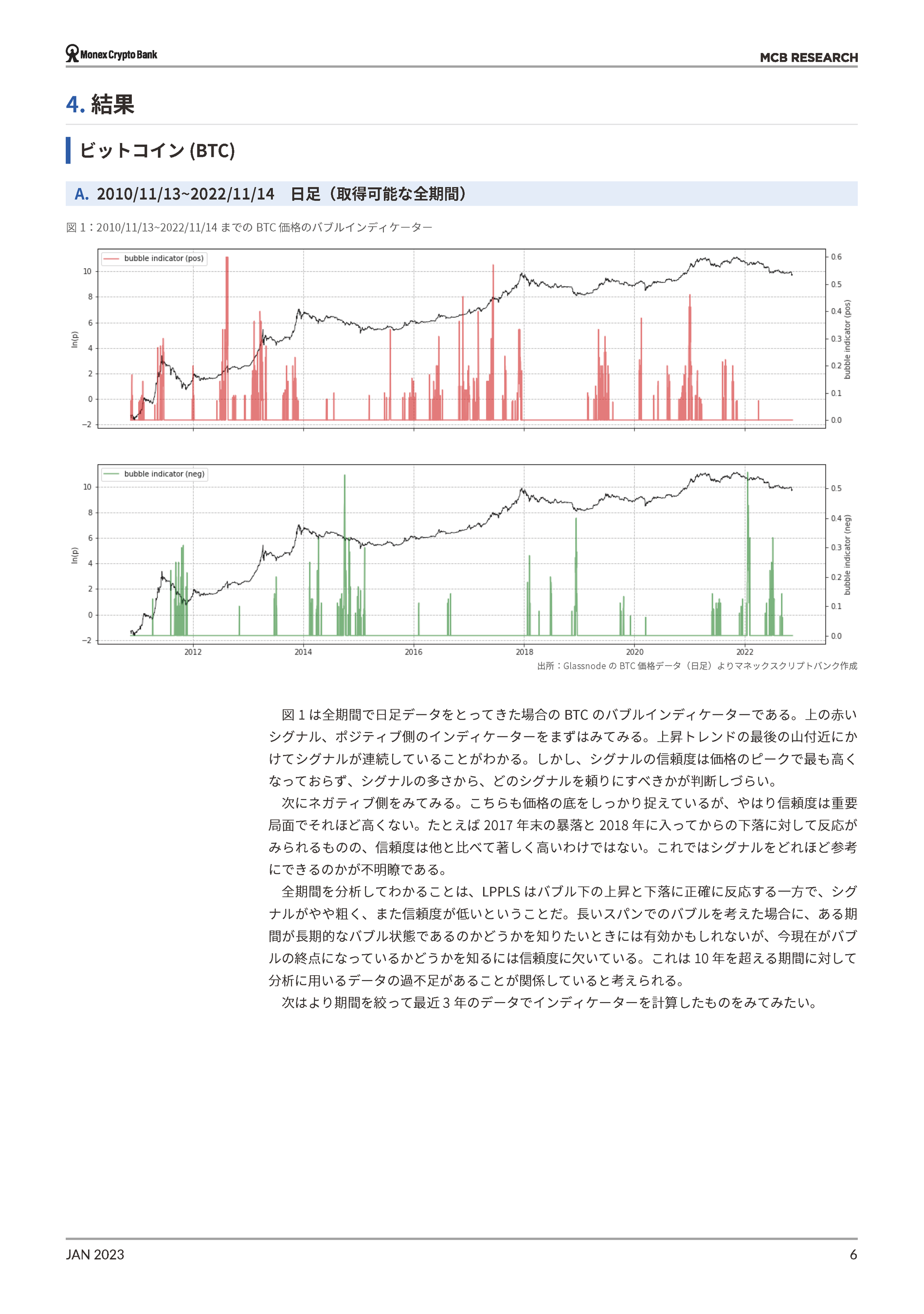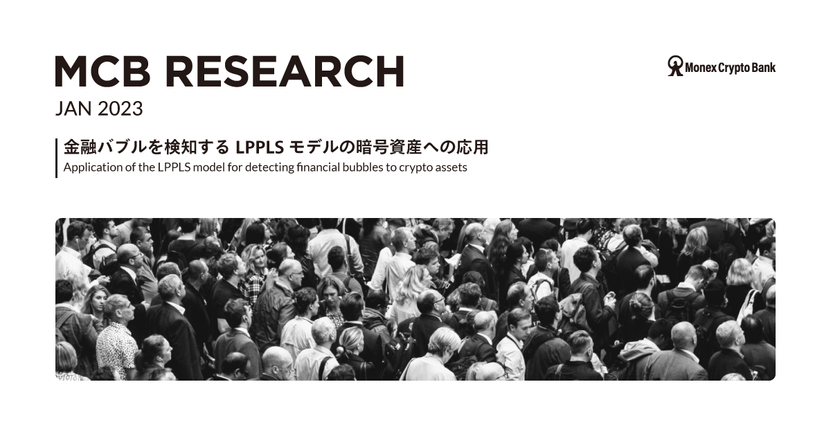 暗号資産市場ではこれまでに多くの価格の高騰と暴落、いわゆるバブルが経験されてきた。その変動率は他の金融資産と比べても著しく高い。ゆえに暗号資産のバブルを検出することは暗号資産投資をする上で個人投資家にとっても機関投資家にとっても非常に重要な指標となりうる。そこで本調査では、金融資産のバブルの終焉を検出するための枠組みとして使用されてきた「LPPLS(Log Periodic Power Law Singularity) モデル」を代表的な暗号資産、ビットコインなどに用いて、先行研究を元にした独自の分析を行った。いくつかの検証の結果、LPPLS モデルの暗号資産への適用は十分に可能であることを示すことができた。また、同モデルが長期的な価格トレンドや短期的な価格の底を検討する上でも有効である可能性を見出した。