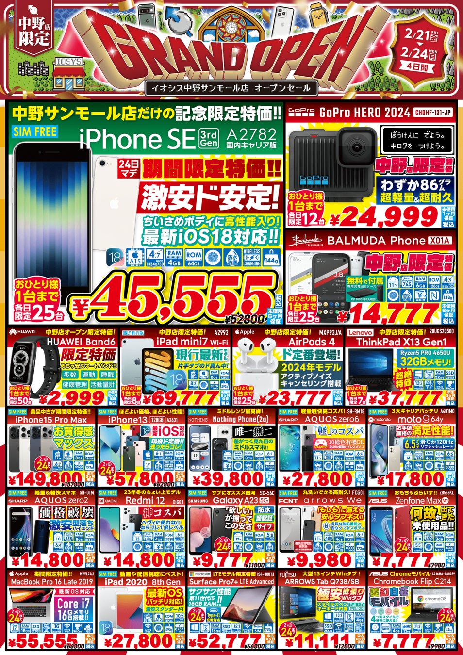 イオシス中野サンモール店においては新店オープンを記念しまして、2月21日(金)〜2月24日(月)の4日間限定で、中野サンモール店限定の大特価販売セールを開催いたします。イオシスの中でも人気の商品を揃えまして、商材一覧はイオシスWEBサイトでもご案内しておりますので、ぜひご覧いただければと思います。