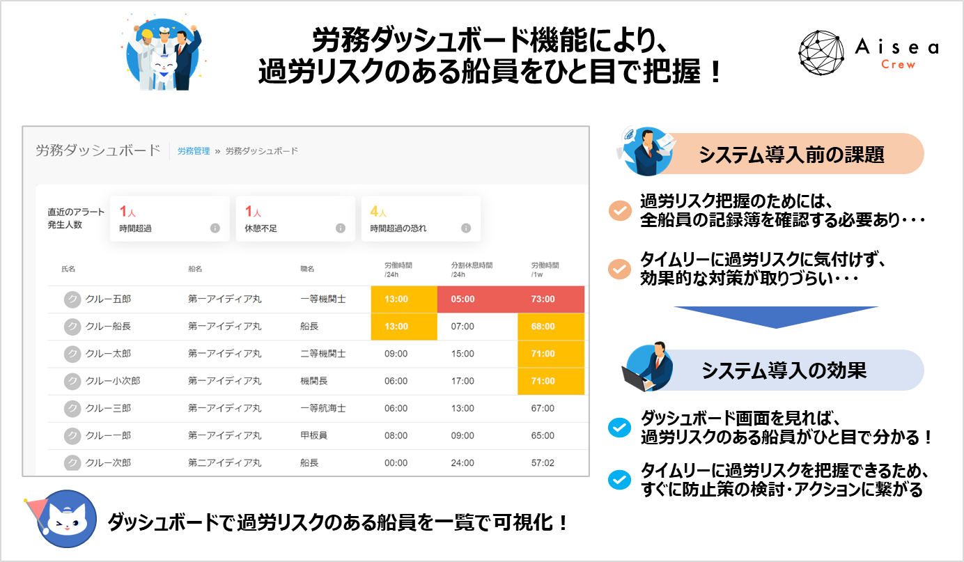 2つ目は過重労働リスクが発生した場合、アラートにより陸上管理者がタイムリーにリスクを把握することができ、速やかに過労防止措置を取ることができるようになりました。システム導入前は、各船員の過重労働リスクを把握するためには全船員の労務状況を個別に確認する必要がありましたが、Aisea Crewの陸上管理者向けWebシステムの大きな特徴である「労務ダッシュボード機能」により、一覧画面で過重労働の恐れのある船員をアラートでタイムリーに確認することが可能となり、過重労働防止措置の高度化へと繋がりました。