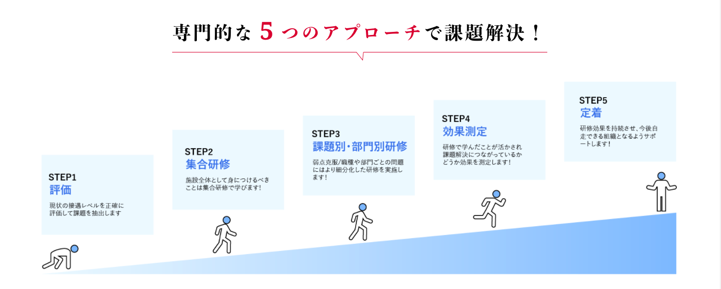 『評価』『集合研修』『課題別・部門別研修』『効果測定』『定着』の5つのアプローチで、接遇のお悩みを解決します。
