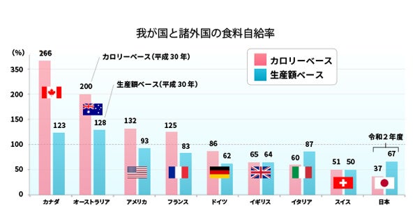- 日本の食料自給率は、主要先進国の中で最低水準