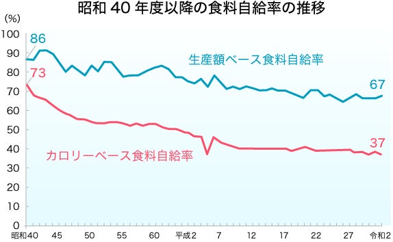 現在の日本の食料自給率は、自給率の高い米の消費が減少し、海外依存の畜産物や油脂類が増えたことで、主要先進国の中でも最低水準となっています。途上国を中心とした人口増加による世界の食料需要増、異常気象や災害、国際情勢の変化、食品の安全性など、輸入食料への不安が高まっています。こうした中で、食料自給率の向上を図ることは喫緊の課題といえるでしょう。