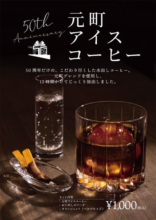 「50th元町アイスコーヒー」は、横浜元町店50周年を記念して復活販売する「50th 元町ブレンド」を使用。水出し専用の器具で約12時間かけてじっくり抽出し、水出しコーヒーならではのまろやかな口あたりに仕上げました。お口直しのソーダと、洋菓子店「ベルグの4月」オリジナルのオランジェットが、「50th元町アイスコーヒー」の味わいを引き立てます。ちょっと大人なアイスコーヒーとともに、贅沢な時間をお過ごしください。