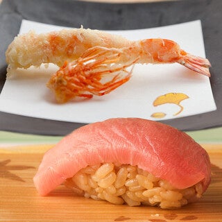 先付け / 前菜 / お造り 2 種 / 天ぷら 4 種 / 季節野菜 / 小丼 / 逸品 / 握り 8 貫 / 海老ドック / 蒸物