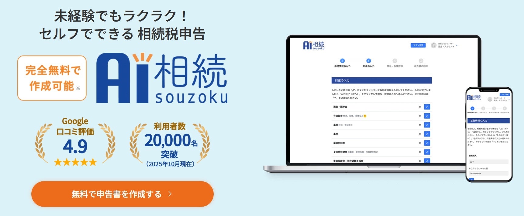 「AI相続」は相続税申告に関する知識がなくても、分かりやすい入力フォームとシステムのサポートにより、自分で相続税申告書を作成できる無料クラウドソフトです。