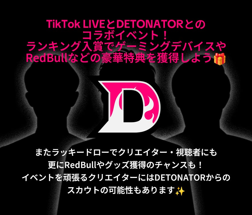 DETONATORはTikTok LIVEとコラボレーションし、この企画を通じて新たな才能を発掘し、ゲーム配信者の夢をサポートすることを目指しています。この機会にゲーム配信を始めたい方の多数ご参加をお待ちしております。