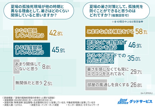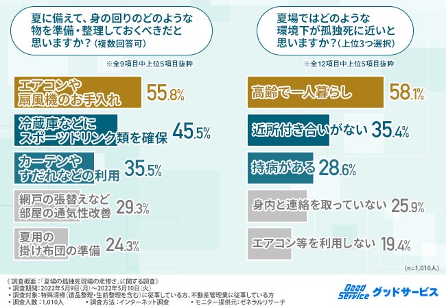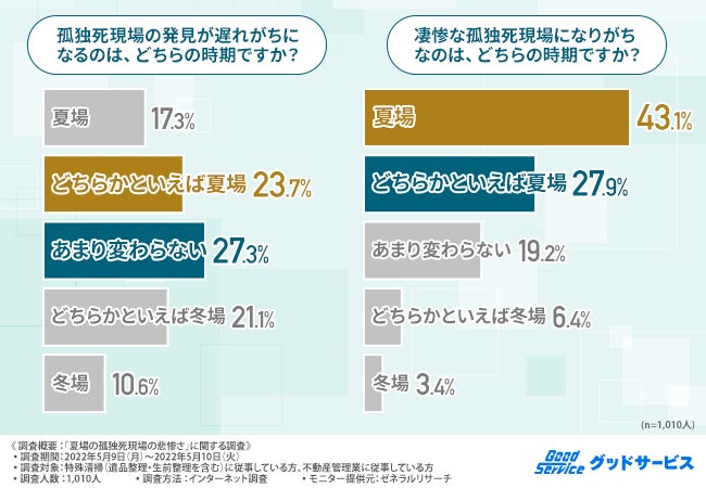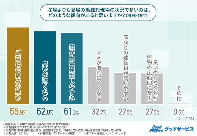株式会社GoodService(本社所在地:名古屋市中区、代表:山村 直秀)は、特殊清掃(遺品整理・生前整理を含む)に従事している方を対象に、「夏場の孤独死現場の悲惨さ」に関する調査を実施しました。