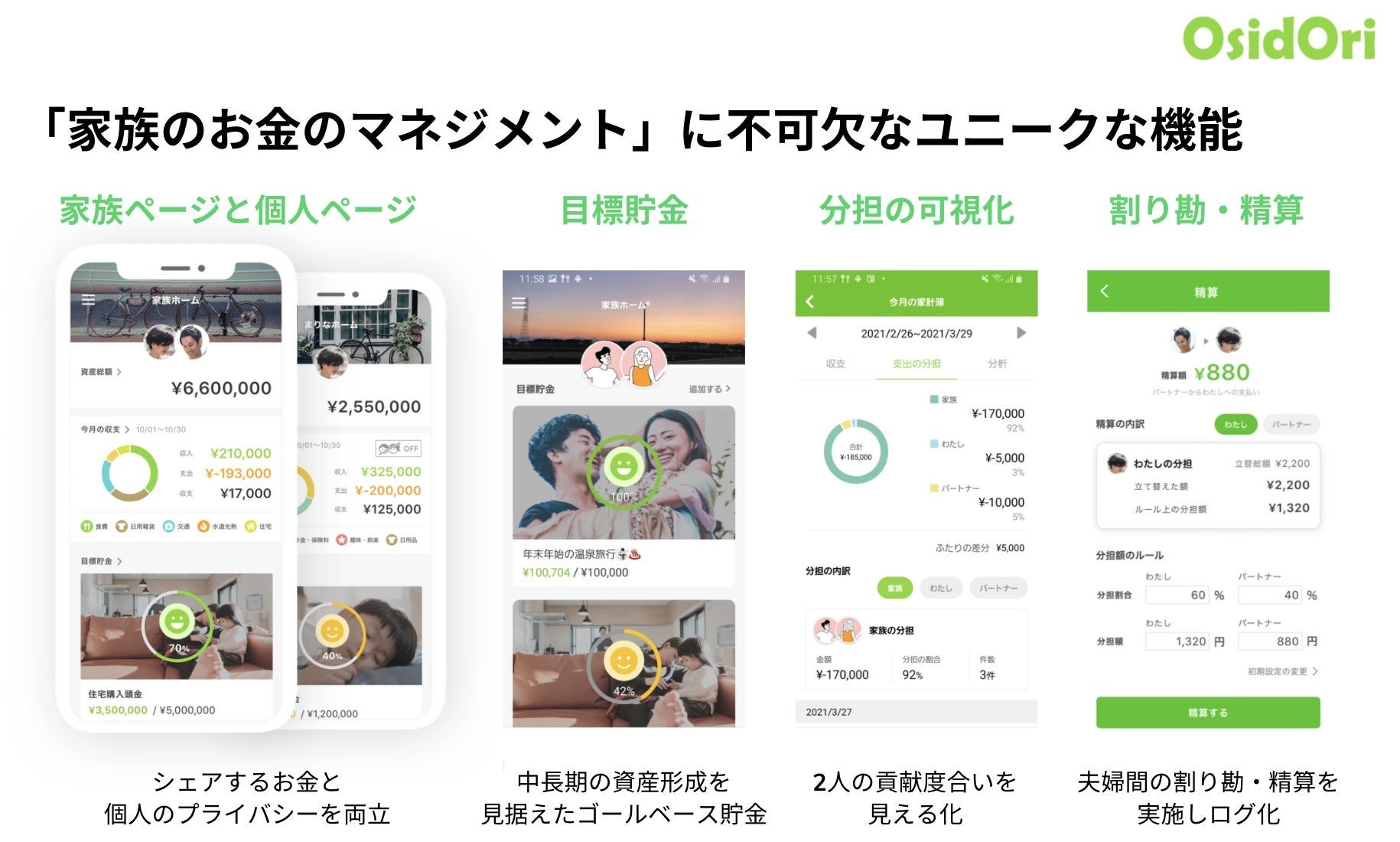 「OsidOri(オシドリ)」は20-30代のミレニアル世代を中心とした30万人以上の夫婦・同棲カップルにご利用いただく、2人共同で家計管理・貯金ができる「家族の金融マネジメントアプリ」です。これまで、サービスを通して「家族のお金の共通理解・コミュニケーション」を促進し、家計改善や将来へ向けた資産形成をサポートしてきました。