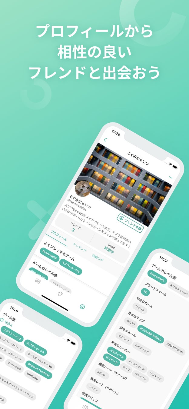 よくプレイするゲーム、ゲームのレベル感、ゲーム歴など、ゲームマッチングアプリだからこそのプロフィールを設定できます。”友達の友達”とはいえ、初対面のときは緊張しますよね。でもゲーマー同士ならお互いのゲーマープロフィールを見て、今ハマっているゲームや子どもの頃にやってたゲームの話など、会話が弾むきっかけを見つけることができます。