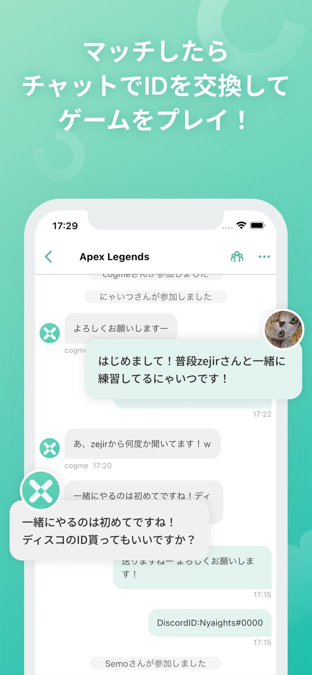 一緒にプレイする仲間が集まったら、チャット機能でID交換をしてゲームをプレイしましょう。cogmeにはボイスチャット機能はありませんが、普段使っているコミュニケーションツールのIDを登録しておけばすぐに呼び出すことができます。