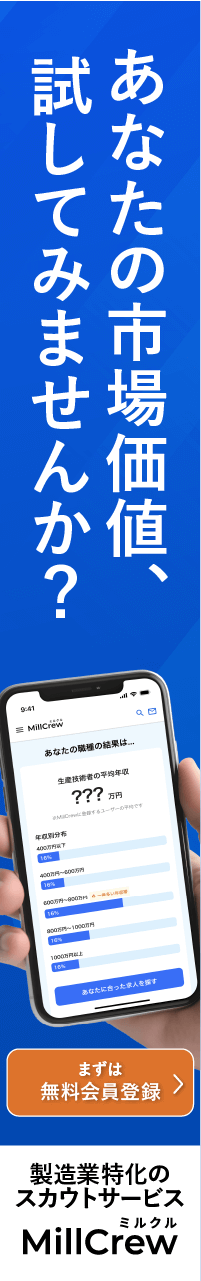 製造業に特化した即戦力技術者のスカウトサービスMillCrewは、経験を活かしたい製造技術者とそれを求める企業・工場とをマッチングさせます。製造技術者の経験、スキルを求める企業・工場からのスカウトを直接受け取ることで、自身の希望を叶える転職活動が可能です。