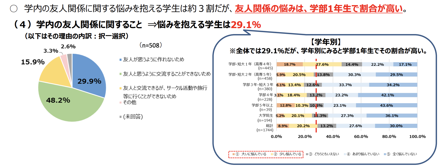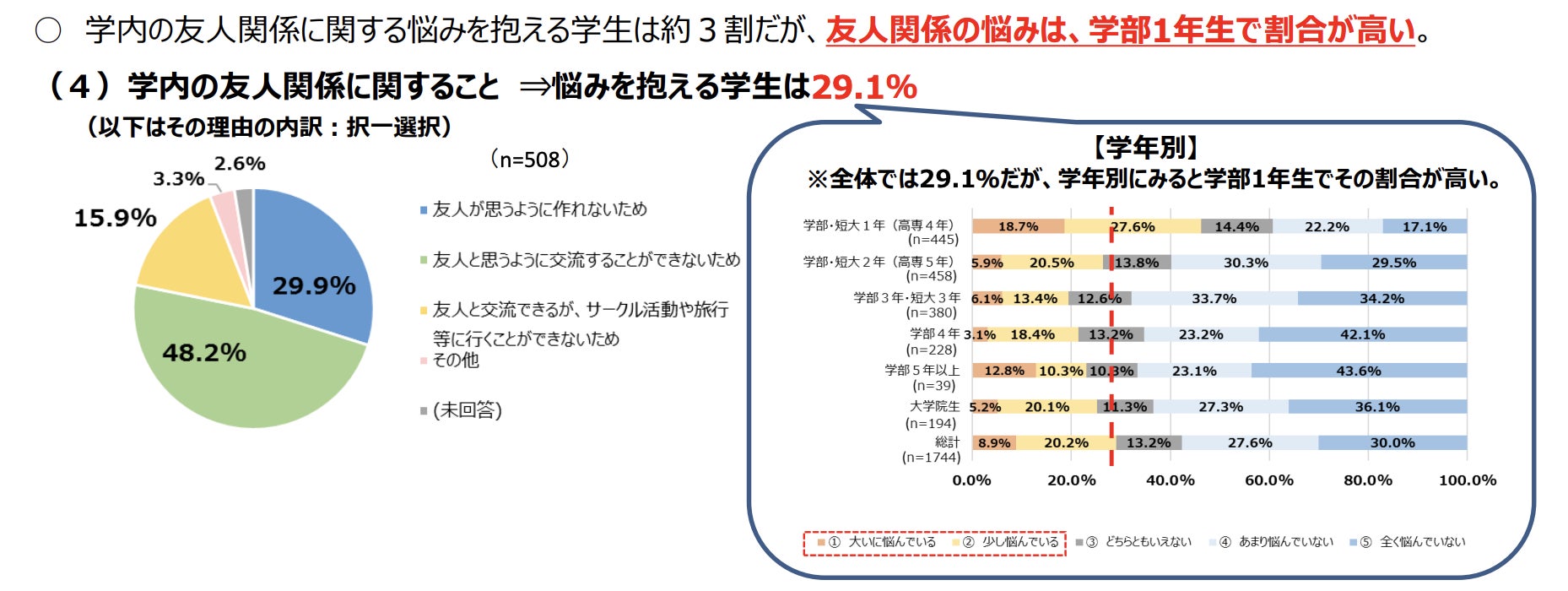 総務省が発表した『新型コロナウイルス感染症の影響による学生等の学生生活に関する調査』※1によると、学生生活において学生が抱える悩みは、授業等が37.9%、将来のキャリアが73.3%、経済的な状況が40.7%、学内の友人関係が29.1%となりました。友人関係の悩みは学部1年生の割合が46.3%と最も高く、「友人が思うように作れない・交流できない」など、1年生の約2人に1人が友人との関わり方について悩んでいることがわかります。また、悩みを改善・解決するための相談先としては、家族や友人、同級生等が多く、学内の教職員等へ相談する学生は17.4%にとどまりました。