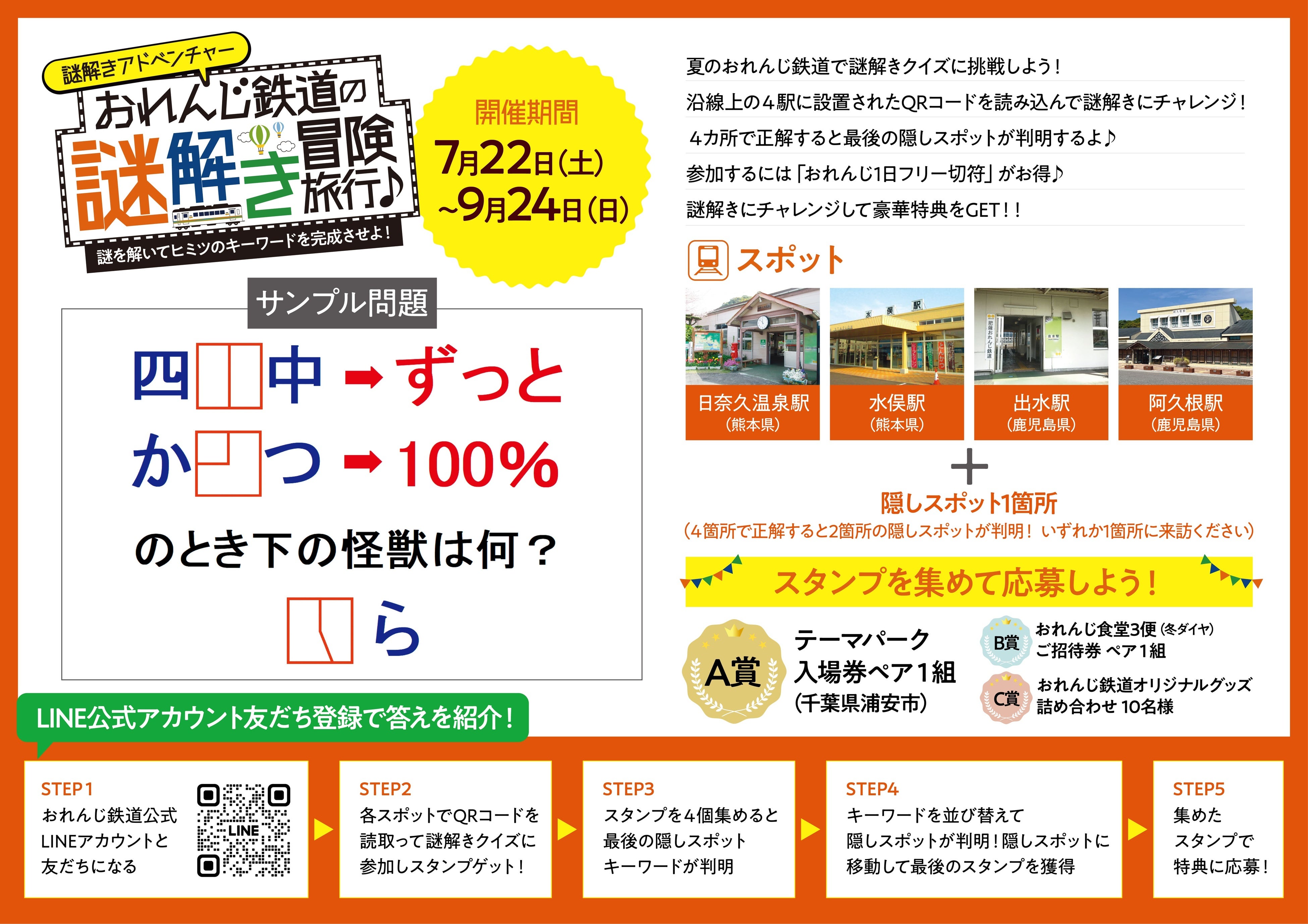 ■イベント概要:夏のおれんじ鉄道で謎解きクイズに挑戦しよう!沿線上の4つの駅に設置されたQRコードを読み込んで謎解きにチャレンジ4つの駅で正解すると最後に隠しスポットが判明するよ♪