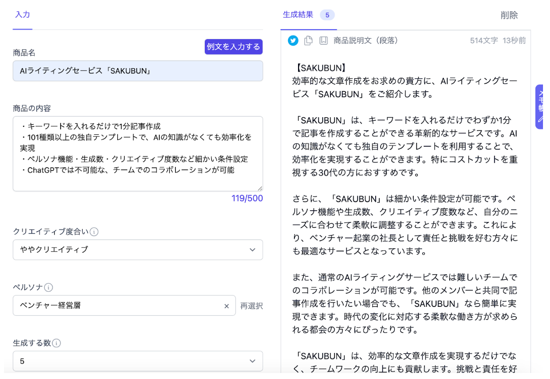SAKUBUNは、そのペルソナ機能を搭載した数少ないのAIライティングツールであり、その効果は他を圧倒します。