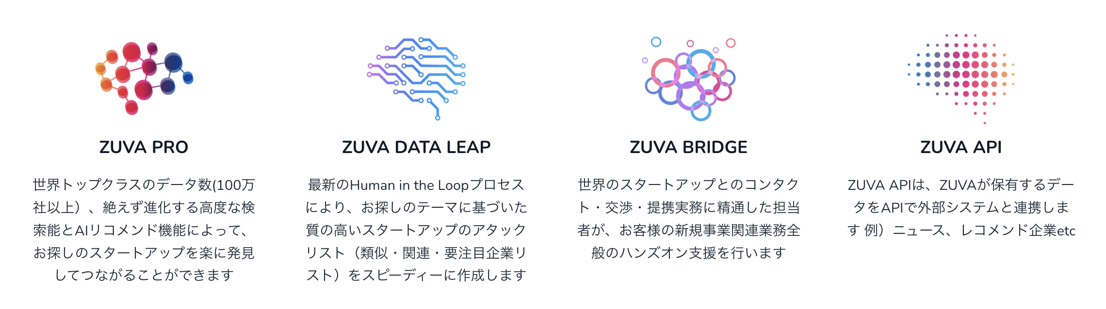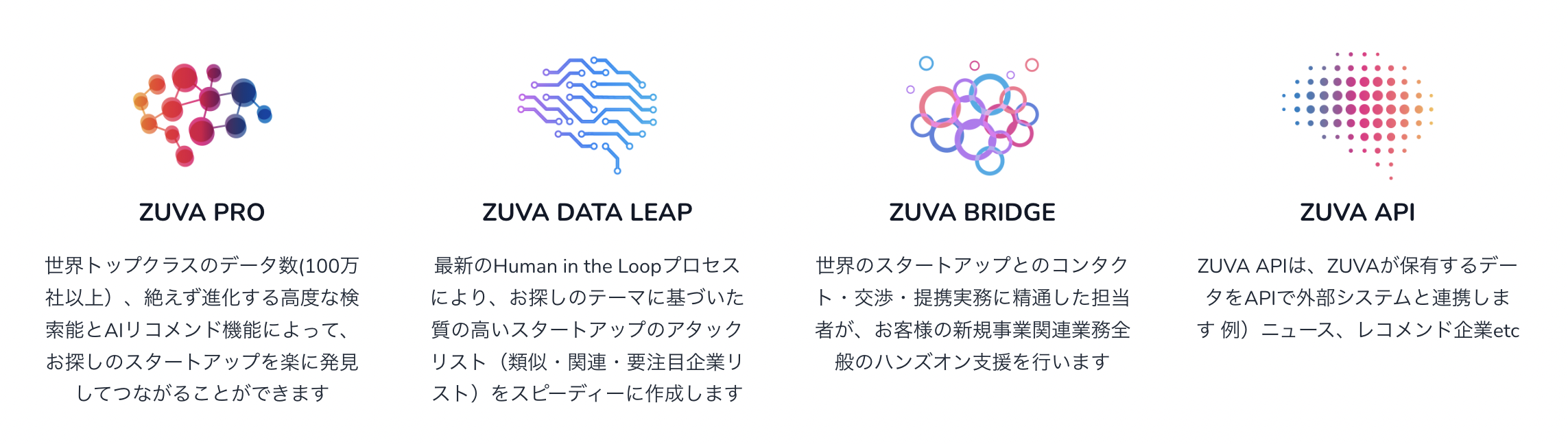ZUVAでは、世界的にも高い競争力を有するStartup Screener(スタートアップDB)である「PRO」の他、事業会社様向けサービスとして、AI-powered 調査サービスである「Data Leap」、新規事業に関するスポットアウトソーシングである「Bridge」、ZUVA独自データの外部連携を行う「API」の4つのサービスを提供しています。