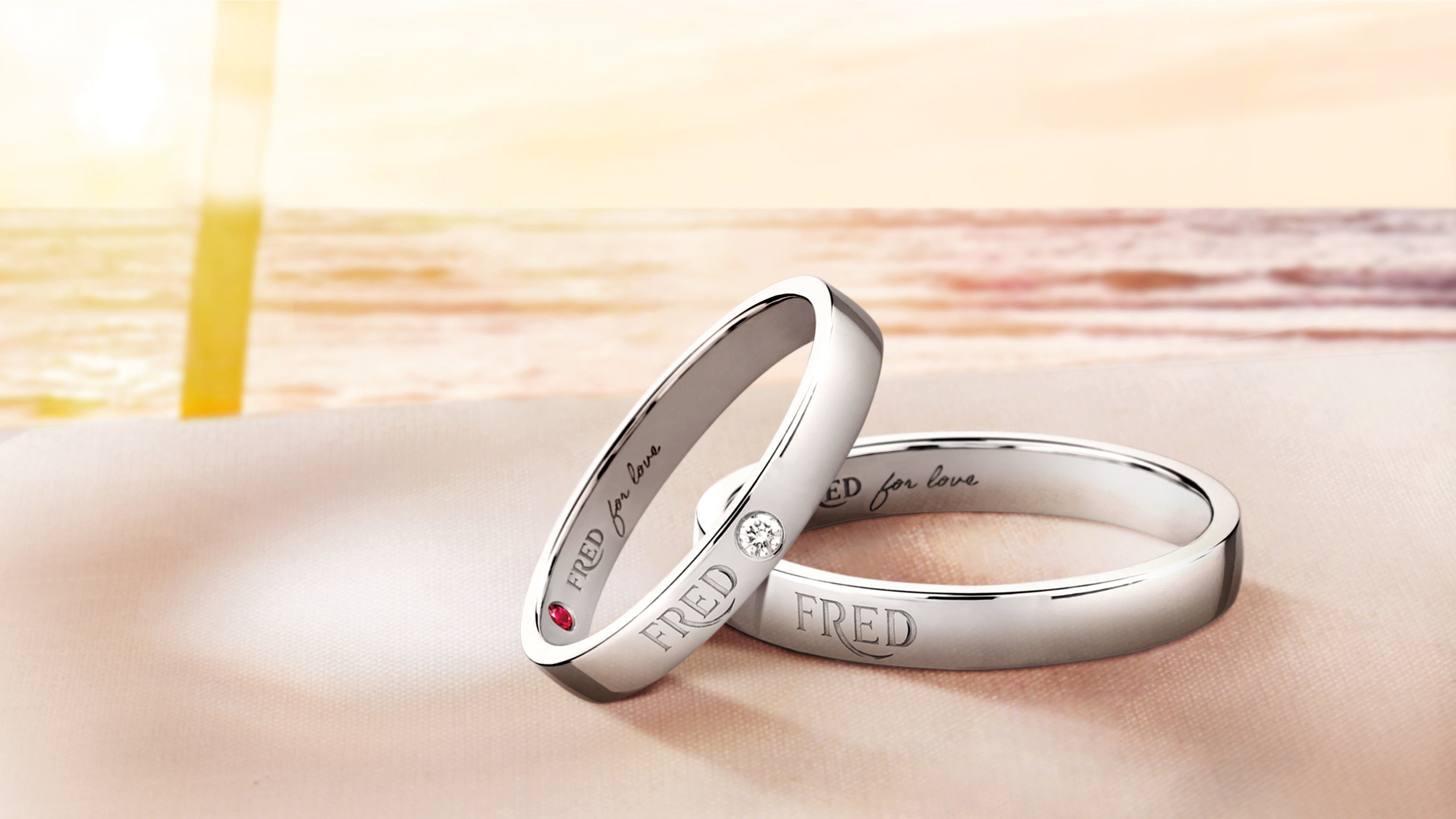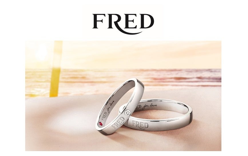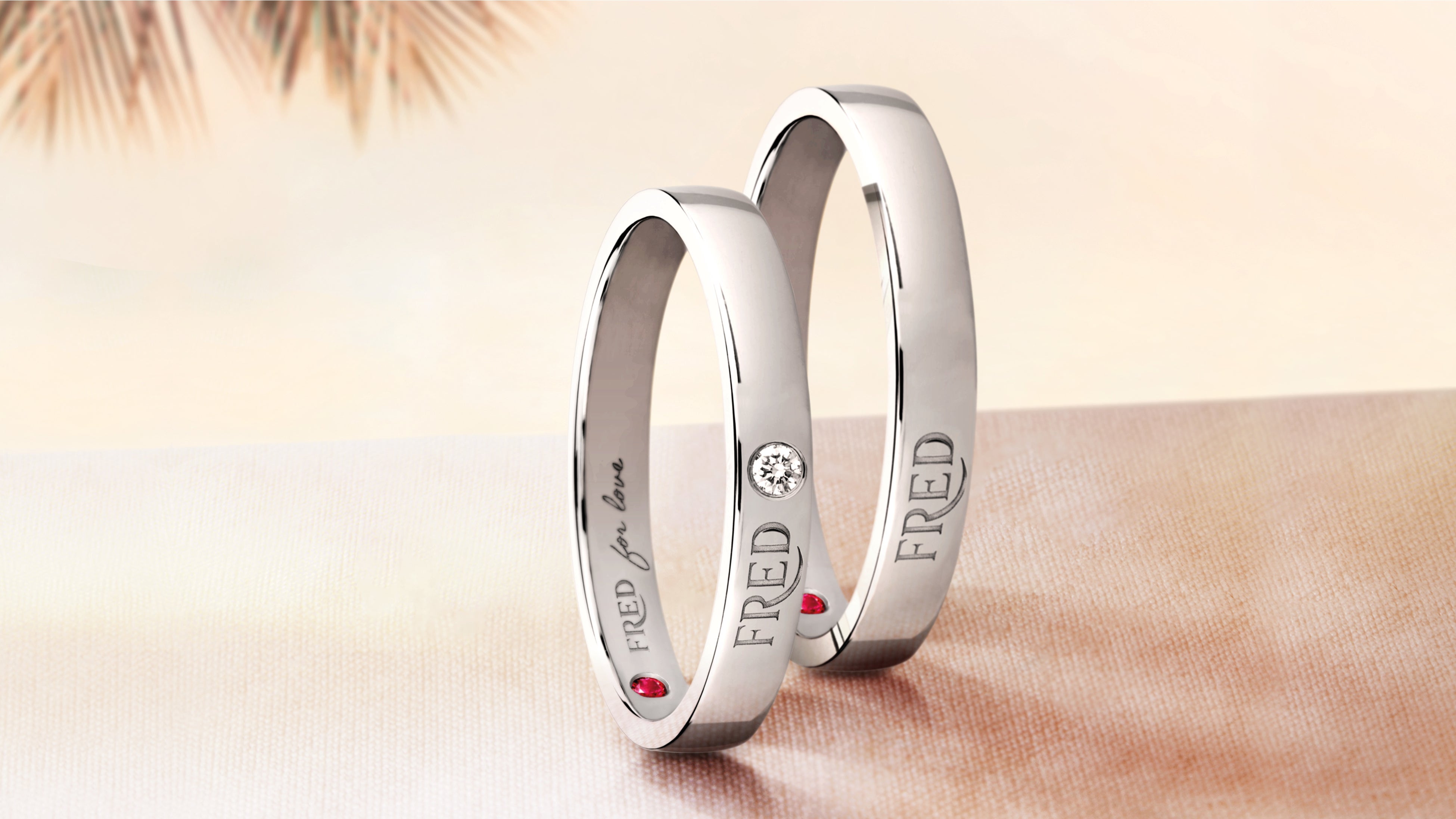 フェア開催と同時に、FREDは新作のウェディングバンド「Fred for Love Wedding Band」を展開し、二人の永遠の愛を祝福しています。外側にはエレガントなFREDの刻印が施され、ダイヤモンドをあしらったものと、シンプルで大胆なデザインと2つのマリッジリングが揃いました。それぞれのマリッジリングの内側には、情熱的なレッドルビーがベゼルセッティングされており、2人だけの秘密が表現されています。ルビーの横には "FRED for love "と刻印され、愛の誓いを表しています。