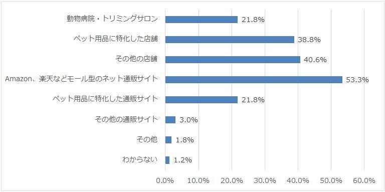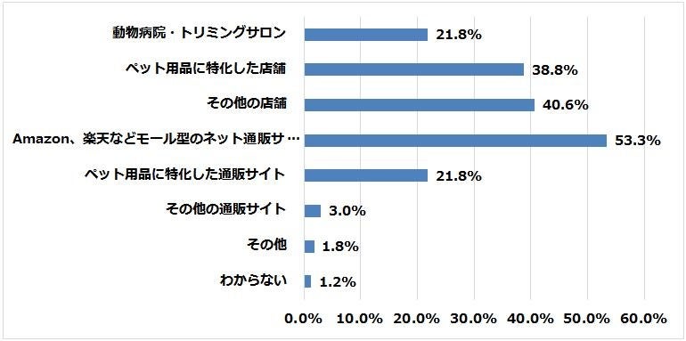 ペット用品やフードを購入する場所は「Amazon、楽天などモール型のネット通販サイト」が53.3%で1位。次いで「その他の店舗」40.6%、3位に「ペット用品に特化した店舗」38.8%という結果でした。