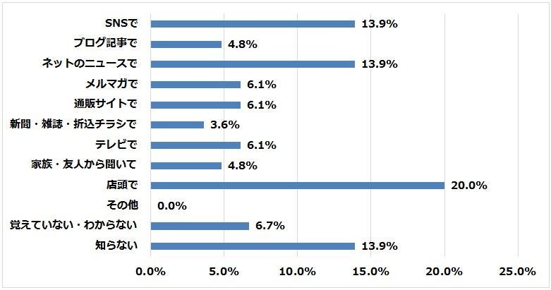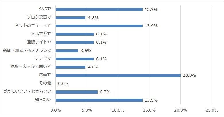 最初に知ったきっかけの1位は「店頭」、次いで同率で「SNS」「ネットニュース」という回答でした。ペット用品を自らお店に買いに行く飼い主さまが多いため、店頭の紹介情報を活用しているようです。