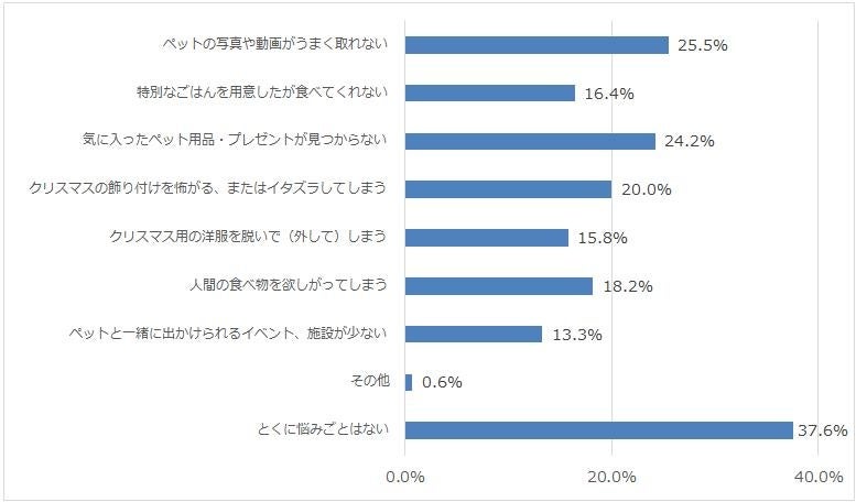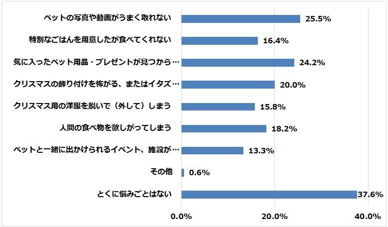 お悩みの1位は「ペットの写真や動画がうまく撮れない」25.5%、2位「気に入ったペット用品・プレゼントがみつからない」3位「クリスマスの飾りつけを怖がる、またはイタズラしてしまう」という結果でした。