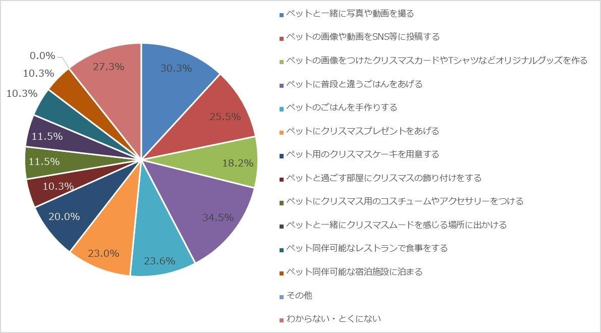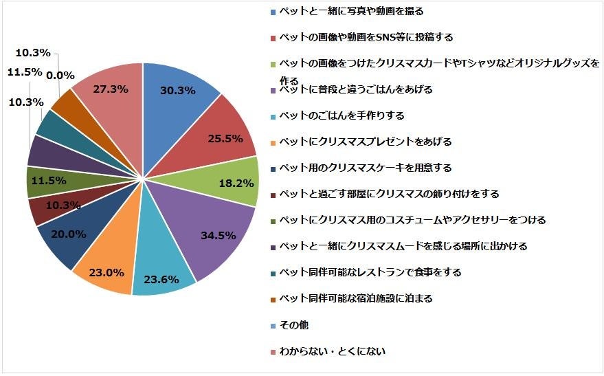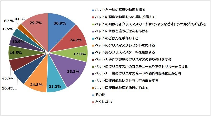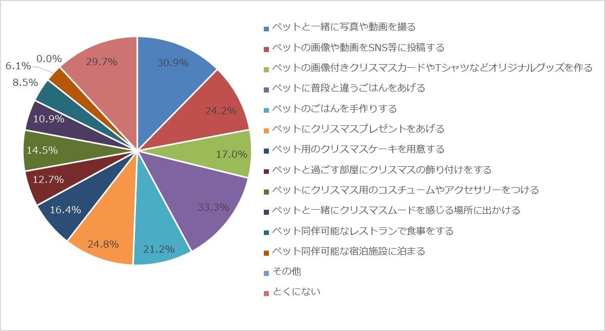 「ペットに普段と違うごはんをあげる」が33.3%で1位、2位は「ペットと一緒に写真や動画を撮る」30.9%、3位は「ペットにクリスマスプレゼントをあげる」となりました。