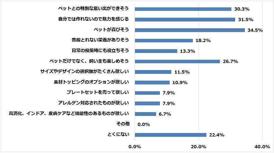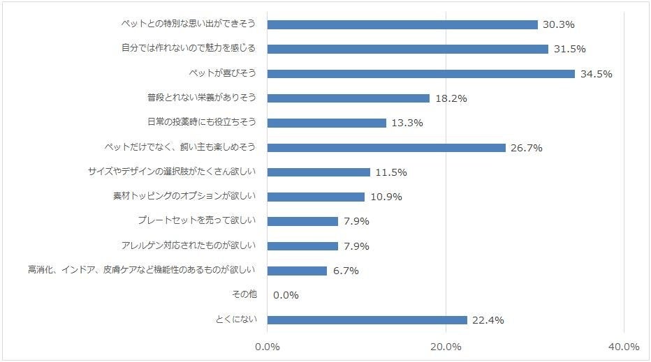 1位は「ペットが喜びそう」34.5%、2位は「自分では作れないので魅力を感じる」31.5%3位は「ペットとの特別な思い出ができそう」30.3%でした。