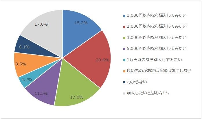 1,000~3,000円以内なら購入してみたいと考えている人が上位を占め、合わせると52.8%の半数以上となりました。さらにその後は「5,000円以内」、「良いものがあれば金額は気にしない」と続きます。