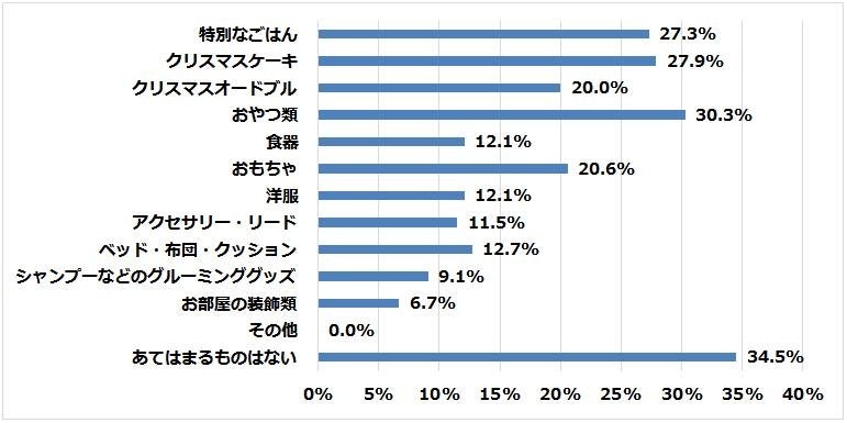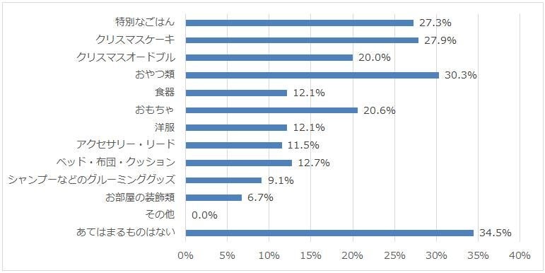 ペットのためにクリスマスに購入するものは、「おやつ類」や「クリスマスケーキ」「手作りごはん」などペットが喜んでくれやすい「特別なごはん」に関するものが上位を占めました。