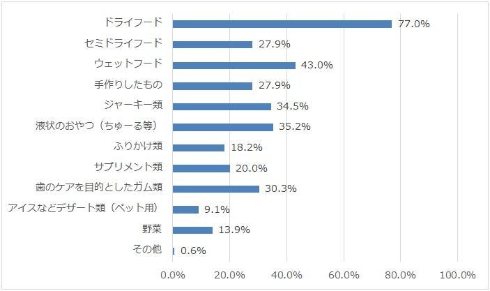 最多は「ドライフード」77.0%で全体の8割となりました。2位「ウェットフード」43%、ついで定番の補助食となる「液状おやつ」35.2%と「ジャーキー類」34.5%が続きます。また、5位には「歯のケアを目的としたガム類」30.3%も挙がっています。