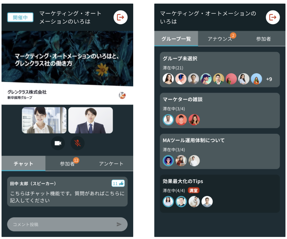 参加者は、セミナー形式で開催する「ステージ機能」および、特定人数に分かれて交流する「グループトーク機能」を含む全てのイベント開催画面に、スマートフォンやタブレットPCからアクセスできるようになりました。