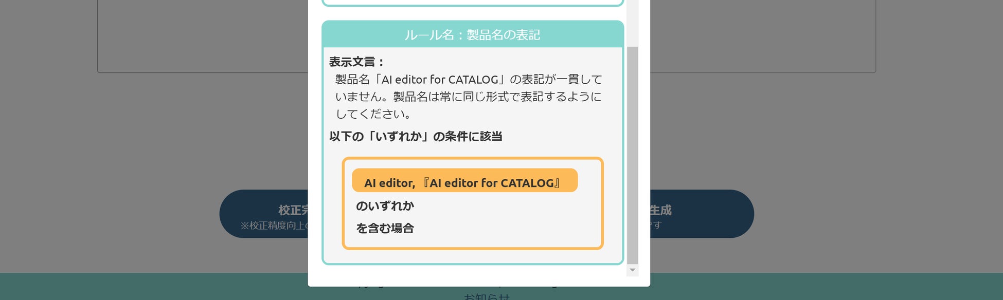 AI・機械学習のアルゴリズムは人間の手作業と同様に検出精度が100%となることはないという理解のもと、AI editorは、誤字脱字検出や表記ゆれ検出機能などのAI・機械学習を用いた検出機能とユーザーがシステム的にオリジナルルールを登録し、誤りを検出する機能のハイブリット構成で校正・校閲を行う仕組みとなっています。これまでAI editorを通じて数多くの利用者の皆様と会話する中で、このハイブリット構成には好評をいただいているものの、自身でルールを登録する際の手間と登録内容の網羅性に課題が残る状態でした。本リリースでは、これらの課題を一部解決する機能として校正・校閲を行いたい文章をもとに次回以降継続してチェックすべきルールを生成AIを用いてサジェスト・登録できる機能を提供いたしました。
