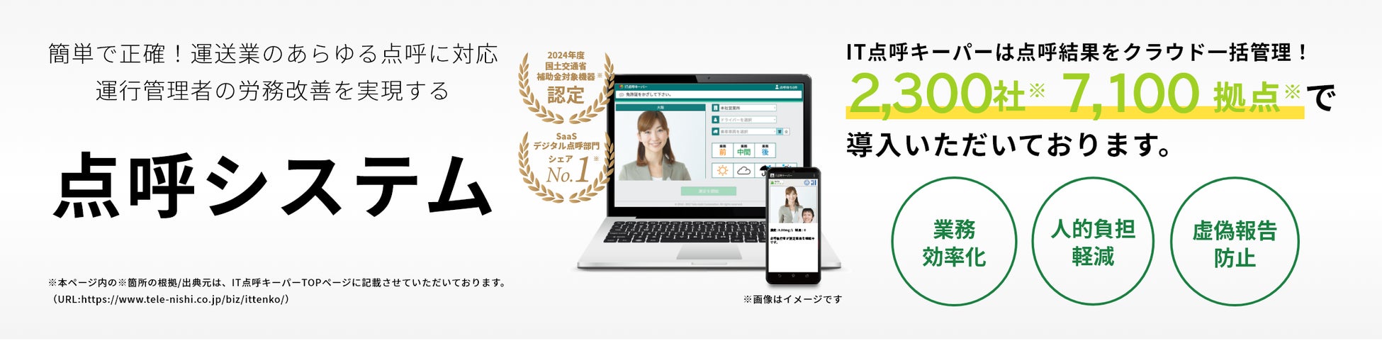 この度、テレニシ株式会社(本社:大阪府大阪市中央区城見一丁目2番27号、代表取締役:髙島 謙一)が開発する貨物・旅客事業者向け総合クラウド点呼システム「IT点呼キーパー」が、国土交通省が実施する「事故防止対策支援推進事業の過労運転防止のための先進的な取り組み」に対する支援における「遠隔点呼機器」および「ITを活用した遠隔地における点呼機器」の対象機器として、2024年度認定を受けました。