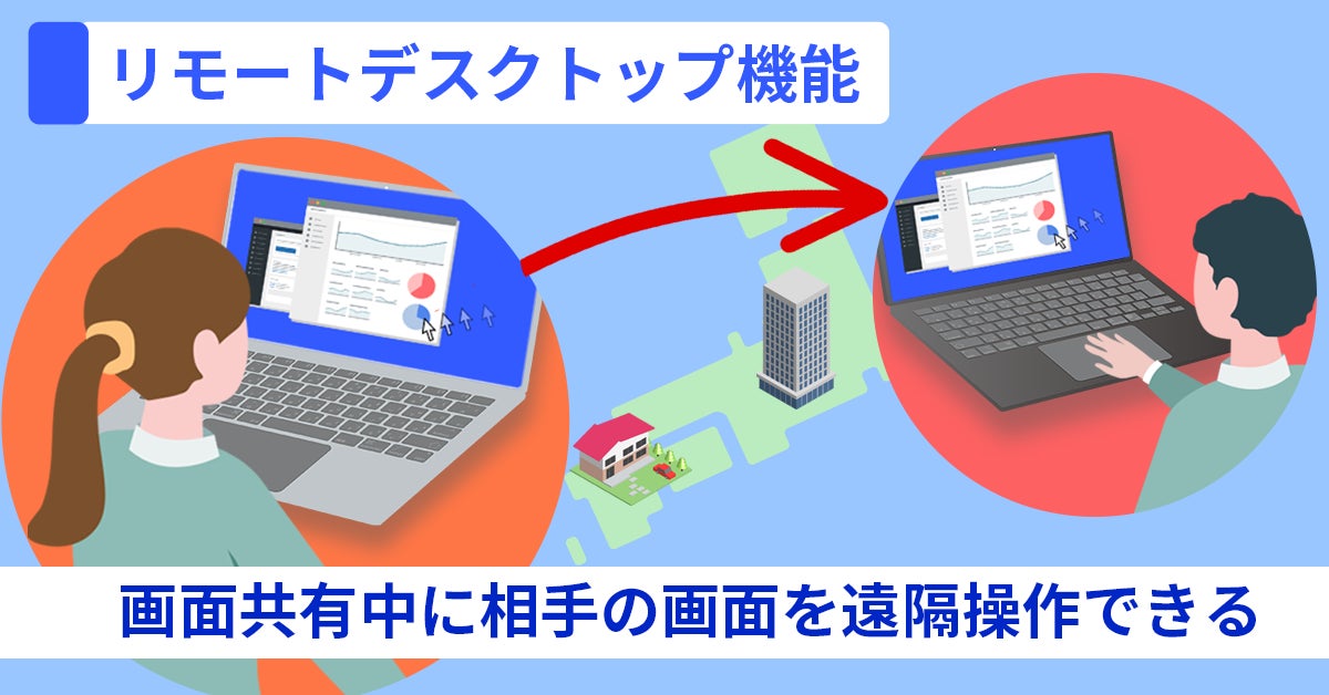 離れた場所同士の人がWEB会議で話していると、相手のPCを遠隔操作してサポートや説明を行いたい場面があります。今回の機能を使うと、画面共有中の相手のPCを遠隔操作できるので、ツールの使い方の説明や具体的な作業を簡単にサポートできます。