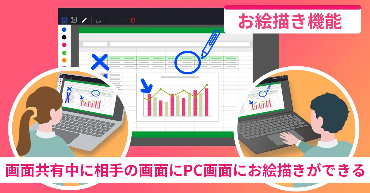 WEB会議中に画面を共有しながら会議や共同作業をしていると、特定のボタンの指定や修正してほしい箇所の指定と修正方法を伝えるなど、口頭の説明だけでは非効率的な場面があります。今回のお絵描き機能を使うと、画面を共有している相手のPC画面に、他のメンバーが描いた絵が現れるので、こういった場面での生産性が向上します。