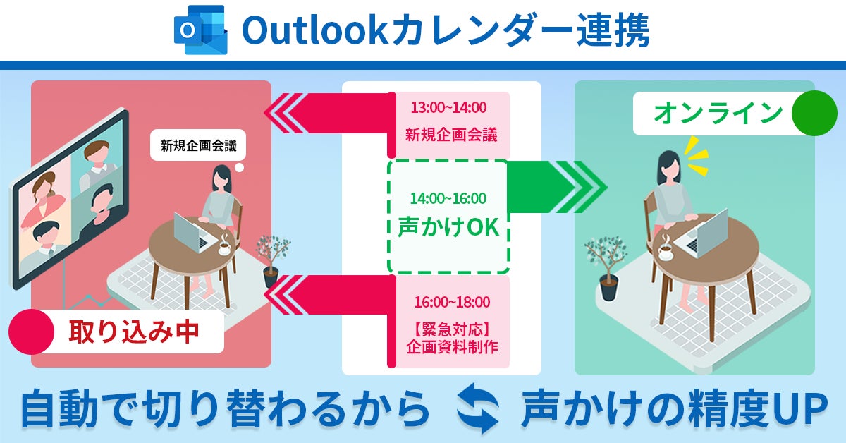 ステータスをMicrosoft社のOutlookカレンダーと連携して自動更新することが可能になり、カレンダー日程のテキスト内容も共有できるようになりました。