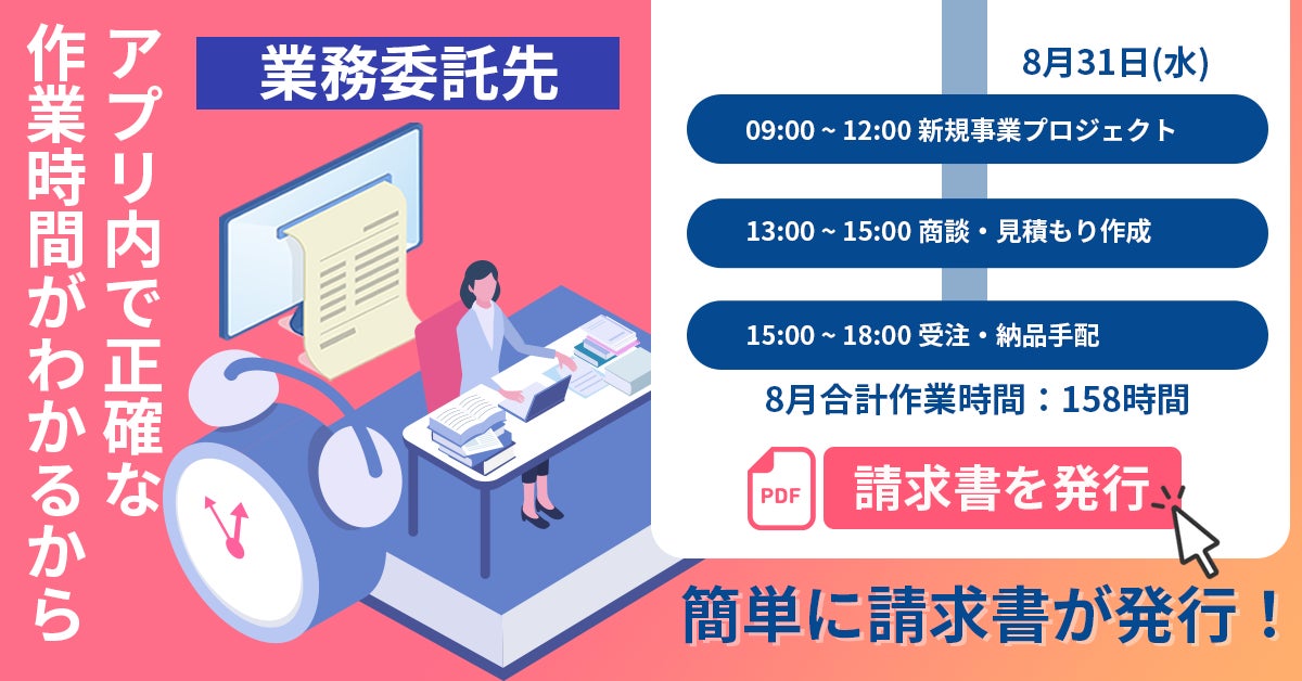 請求先、時間、時給を入力して請求書を作成し、PDFで出力できる機能をアプリに内に実装しました。手動で作業ログを修正(上述)する機能を利用しながら、正確な作業時間を入力し、それを元に会社と社員が両方納得できる請求書を発行することが可能です。