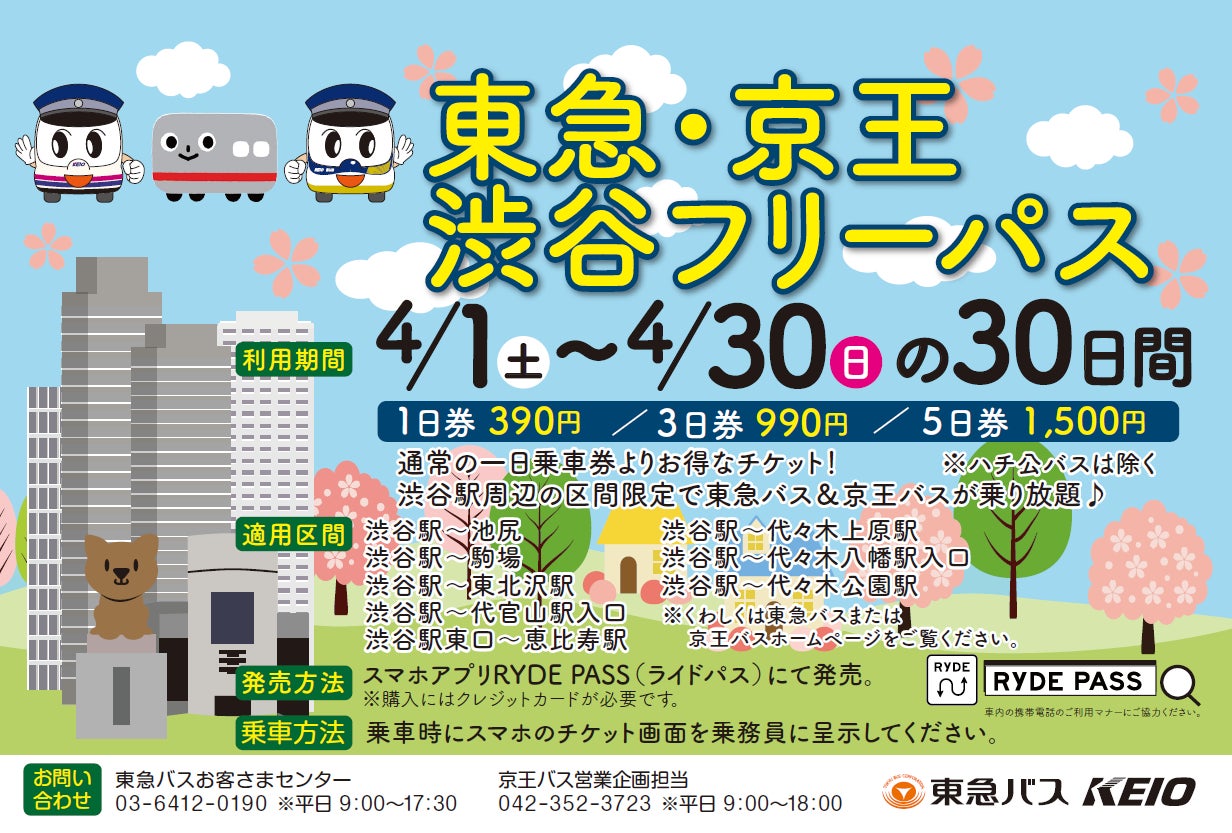 東急バス株式会社(本社:東京都目黒区 社長:古川 卓)と京王バス株式会社(本社:東京都府中市 社長:宮坂 周治)は、2023年4月1日(土)~2023年4月30日(日)の30日間の期間限定で、渋谷駅周辺の東急バスおよび京王バスの路線がどちらも乗り放題で利用できるお得な企画乗車券「東急・京王 渋谷フリーパス」を発売いたします。この乗車券は冬休み期間に発売した「東急・京王 渋谷フリーパス」(実施期間18日間)に引き続き、利用範囲はそのままに利用期間をさらに拡大しました。スマホアプリタイプの乗車券で渋谷駅周辺エリアの気軽な移動をサポートいたします。散策やお買い物、ビジネスなど生活シーンに合わせてご活用ください。