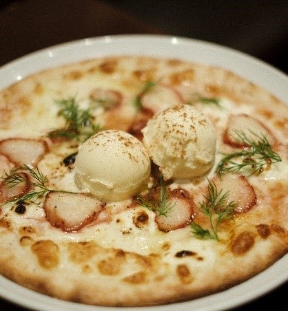 ふっくら、もちもち食感のナポリピッツァをデザートとしていただく逸品。マスカルポーネや数種類のチーズ、国産の”とちおとめ”を焼き込み、バニラアイスクリームをトッピング。温かくなった苺は甘みが際立ち、冷たいアイスとの相性も抜群です。