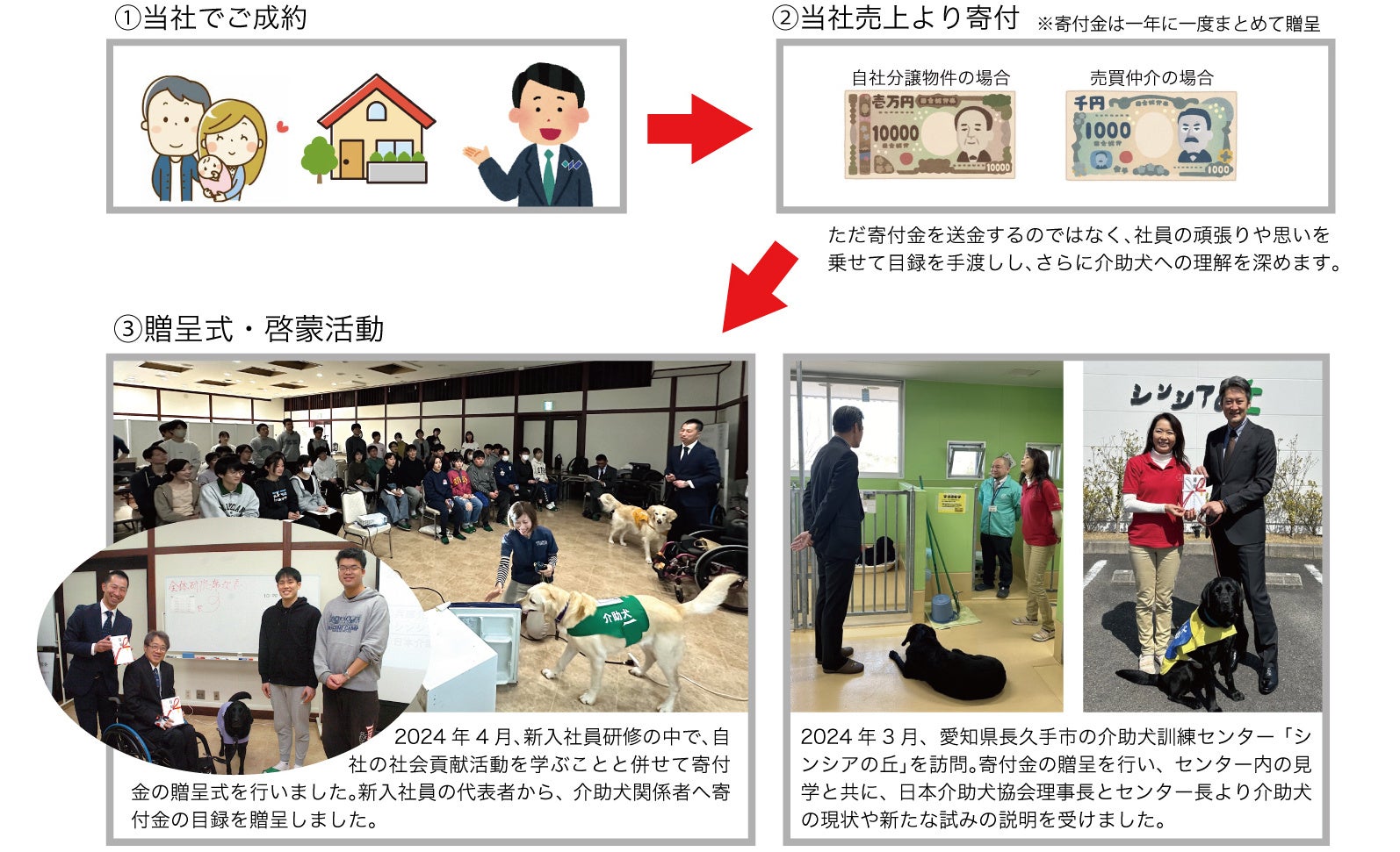 創業10年目の2003年、当社の創業者が介助犬の誕生を扱ったテレビドラマ「シンシア~介助犬誕生ものがたり」に出逢いました。創業の地である宝塚を舞台としたドラマには、私たちの日常にある風景が映し出され、そこで頑張る主人公(現在、日本介助犬使用者の会会長 木村佳友氏がモデル)に共感を覚え、介助犬支援活動を始めました。以来、支援のきっかけとなったドラマを視聴、全拠点に募金箱を設置、不動産の広告に介助犬のイラストを掲載、チャリティイベントの開催、寄付型自動販売機の設置など、様々な方法で支援を行ってきました。当社のウェブサイトには、介助犬ページを設け、介助犬を詳しく紹介しています。