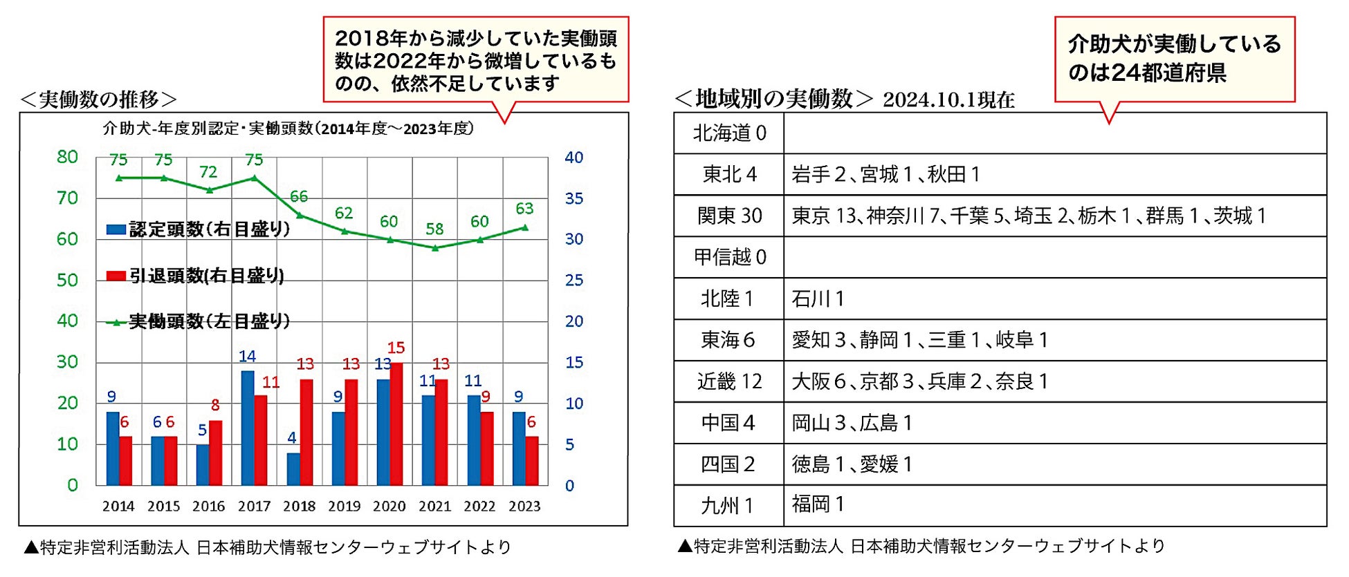 約75年の歴史のある盲導犬と比べ、介助犬は約30年と歴史が浅く、認知度も低く頭数も少ない状況です。2024年10月1日現在の実働頭数は、盲導犬の796頭に対して60頭。介助犬が実働している都道府県は、右下の表のように24都道府県のみ。介助犬を見かける機会も少ないはずです。訓練事業者の規模も盲導犬に較べて脆弱な団体が多く、年間の育成頭数も盲導犬の百数十頭に対して十頭前後。そのような中、介助犬を必要とする人は約15,000人と言われ、育成が急がれます。